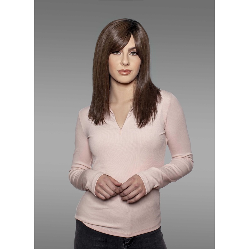 Long soft face framing style with parting or playful bangs for a versatile and modern look.Monofilament Top (Mono-Top): Fine nylon mesh with individual hairs hand-tied into the mesh. Allows Hair to be parted in different directions and creates illusion of