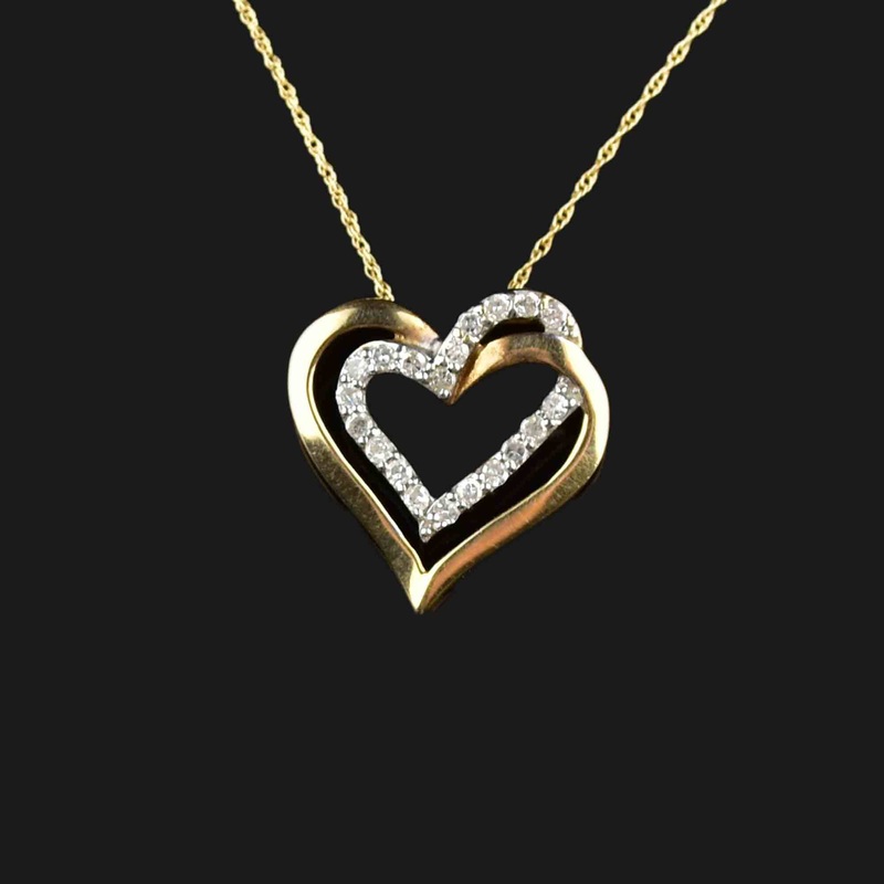 Elegant and sophisticated, this beautiful heart pendant showcases sparkling white diamonds set in lustrous 10K gold. The double heart design boasts a solid gold heart with a second heart encrusted with dazzling diamonds. The perfect blend of uniqueness and timelessness, this necklace makes for an ideal gift to express your love for someone dear to you.