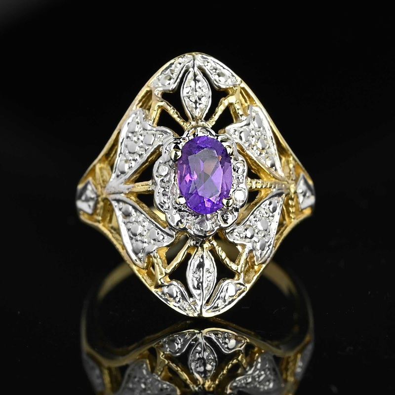 This wonderful vintage ring has an elevated oval amethyst stone in a beautiful filigree of 10K white and yellow gold. The medium purple natural gem is showcased with a cascading floral and leaf panel, giving off a truly stunning and classic look!