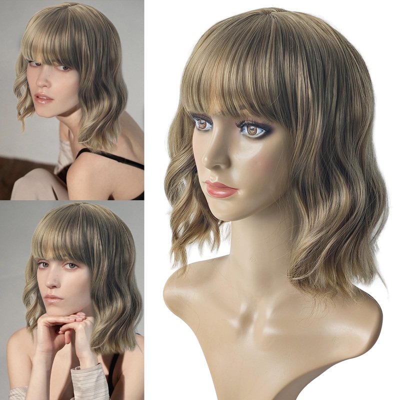 Elevate your style with our 14-Inch Wavy Blonde Bob Wig with Full Bangs, crafted from high-temperature synthetic fiber for a natural, realistic appearance. This flexible and durable material closely resembles real hair, offering a soft, tangle-free, and easy-to-care-for experience.