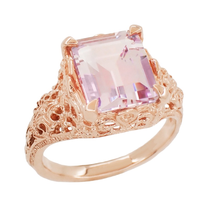 14 Karat Rose Gold Edwardian Filigree Emerald Cut Rose de France Ring