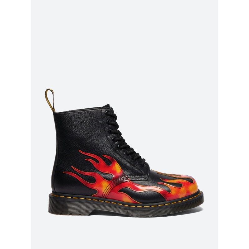 The 1460 8-eye boot is updated with fiery appliques layered over shiny Overdrive leather for a bold, high-energy finish. The appliques are crafted from Arcadia, a three-color rub-off leather that gives a unique look to every silhouette. With buzz saw-inspired eyelets, the boot is finished with black laces, a scripted heel loop, yellow welt stitching and a smoke DMS sole with classic grooving.