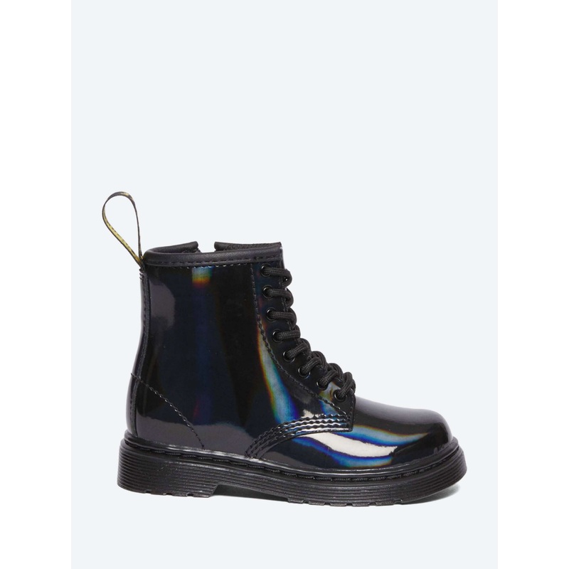 High shine, high impact. Dr. Martens iridescent Black Rainbow PU brings a different shine to every step. A standout choice for young DM's fans. Set on a lightweight, flexible edition of our signature air-cushioned sole, these 1460 Toddler boots are detaile
