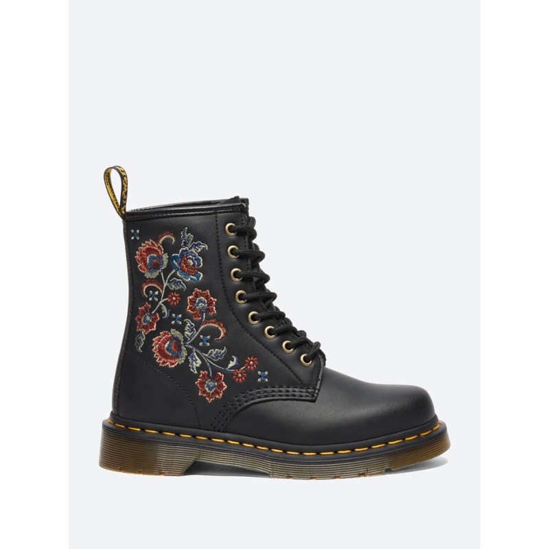 Threaded with British spirit. The 1460 Vonda 8-eye boot takes inspiration from the interiors of classic British pubs and music venues. Crafted with reclaimed Genix Nappa leather, its decorated with antique gold eyelets and embroidered with unique Tavern Floral stitching which cascades down the quarters. Signature DMs detailing includes a scripted heel loop, yellow welt stitching and a DMS sole with classic grooving.