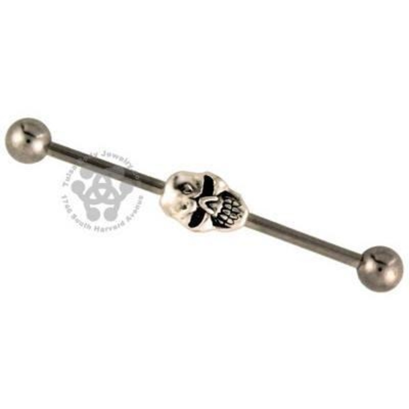 The 14 gauge angry skull industrial barbell is made from 316L stainless steel with external threading. The charm is fixed to the barbell.