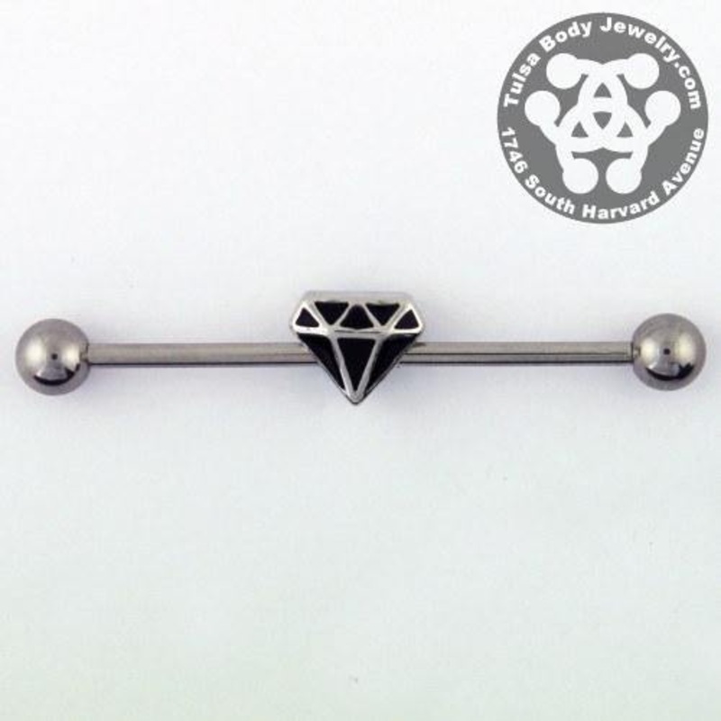The 14 gauge black diamond industrial barbell is made from externally threaded 316L stainless steel. The charm is fixed to the barbell.