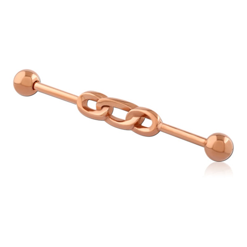 The 14 gauge chainlink industrial barbellismade from rose gold PVD coated 316L stainless steel with external threading.