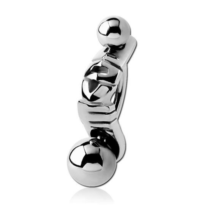 The 14 gauge 15/32″ curved barbell is made from 316L stainless steel with external threading. The love shield is also made from solid steel, but note that it reduces the wearable area of the curved barbell to 5/16″.
