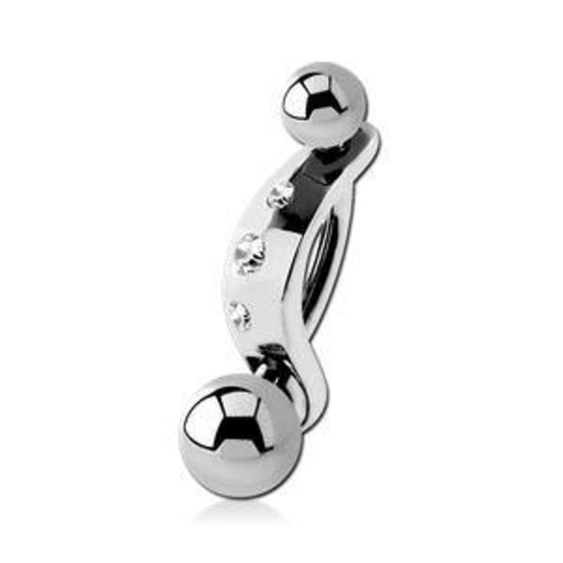 The 14 gauge 15/32" curved barbell is made from 316L stainless steel with external threading. The triple cz shield is also made from solid steel, but note that it reduces the wearable area of the curved barbell to 5/16". Choose your color below.