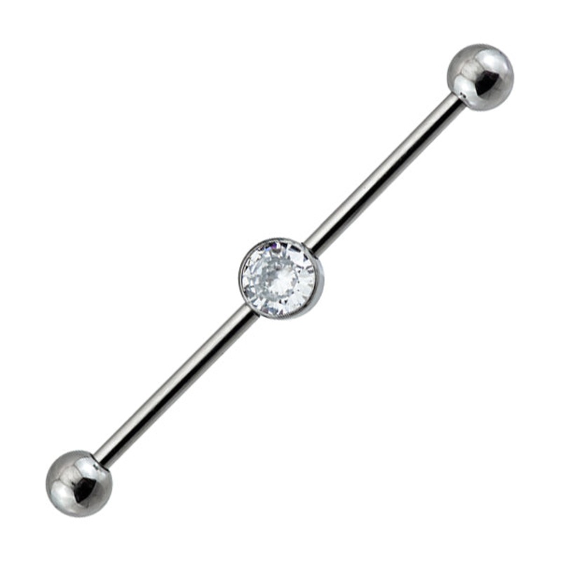 The 14 gaugeczcenter industrial barbell is made from high polish grade 23 titanium (Ti 6Al-4V ELI ASTM F136) with external threading. The 5mm cz charm is fixed to the barbell.