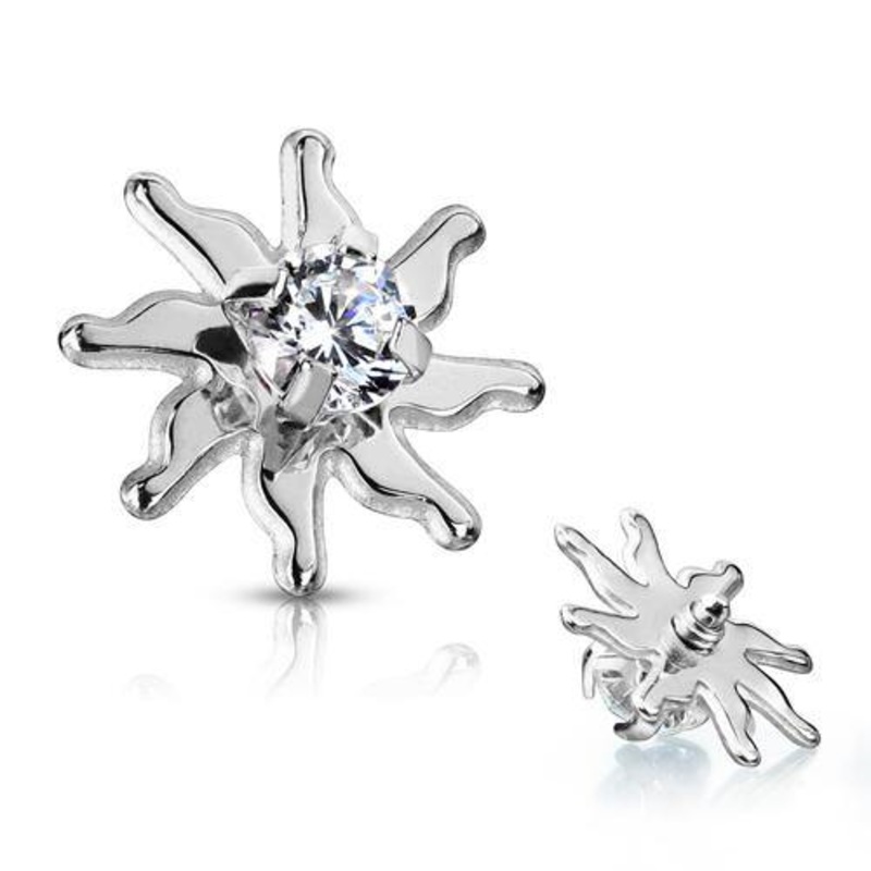 The 14 gauge czsunburstis made from316L stainless steel. Ithas an overall diameter of approximately 8mm. These will fit most any 14 gauge internally threaded straight barbell, labret or dermal anchor. We cannot guarantee compatibility with curved barbells. Available with a clear cz only.