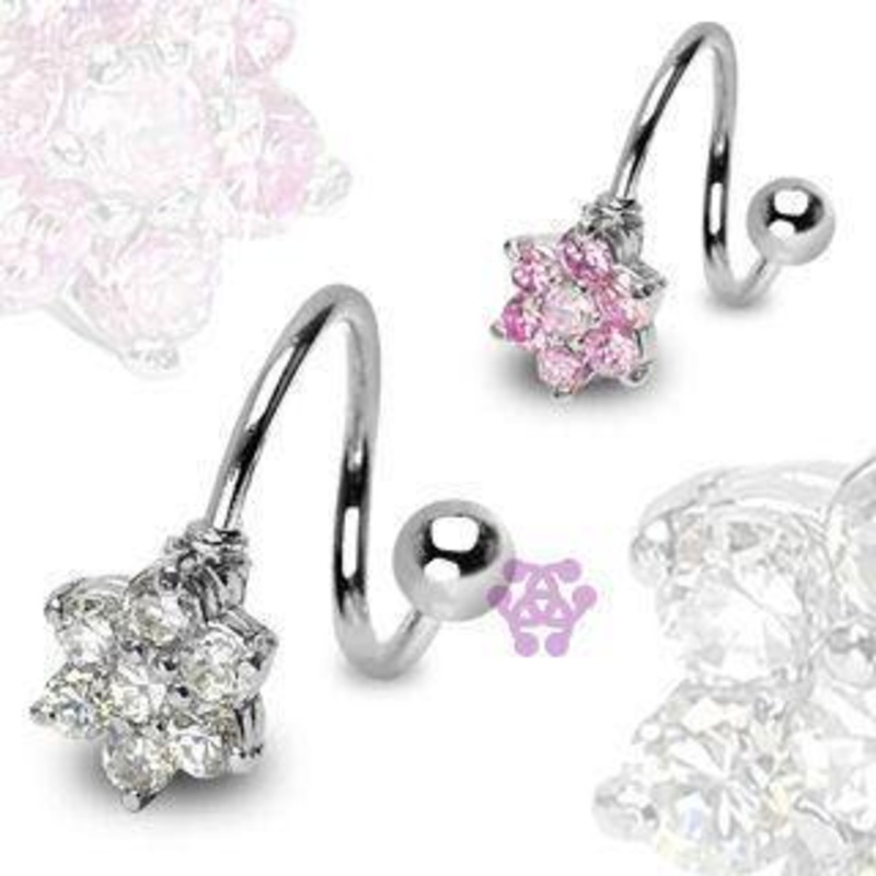 The 14 gauge flower cz spiral barbell is made from 316L stainless steel with external threading. Only the 5mm ball end is removable. Choose your gem color below.