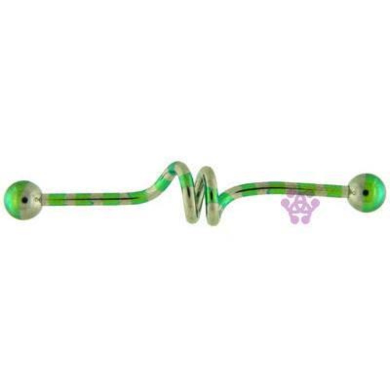 The 14 gauge green striped corkscrew industrial barbell is made from anodized 316L stainless steel with external threading.