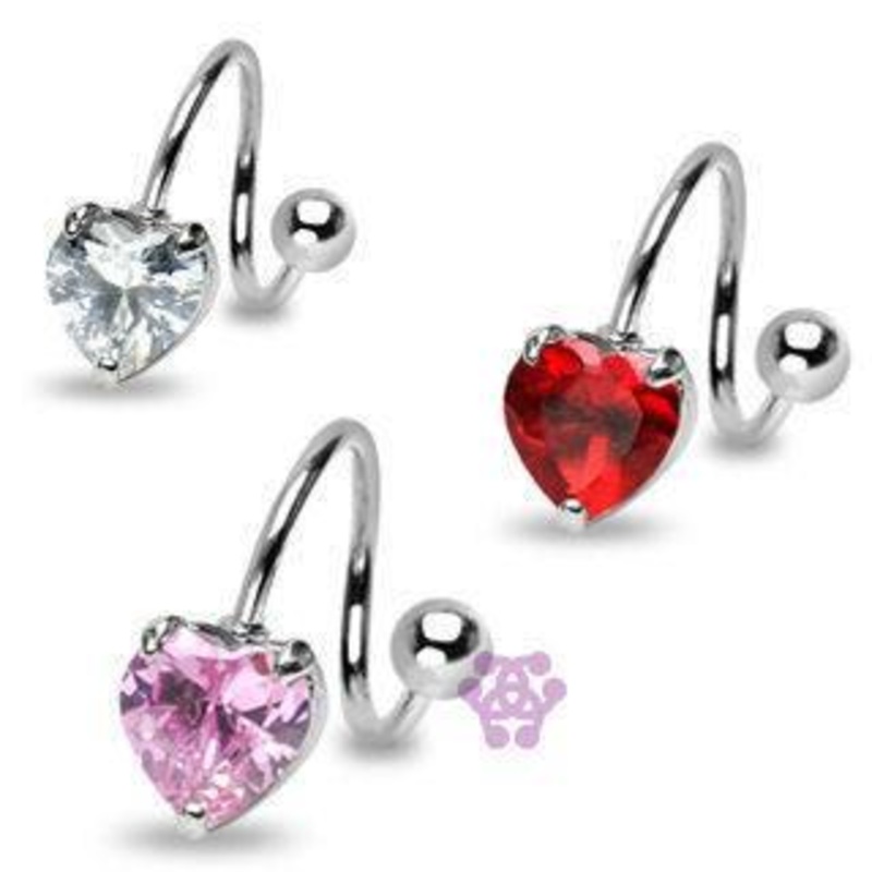 The 14 gauge cz heart spiral barbell is made from 316L stainless steel with external threading. Only the 5mm ball end is removable. Choose your gem color below.