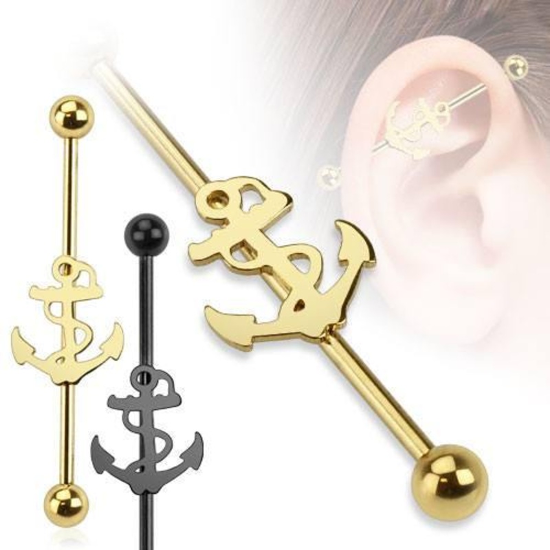 The 14 gauge nautical anchor industrial barbell is made from 316L stainless steel with external threading. The charm is fixed to the barbell. Choose between the blackline or gold finish below.