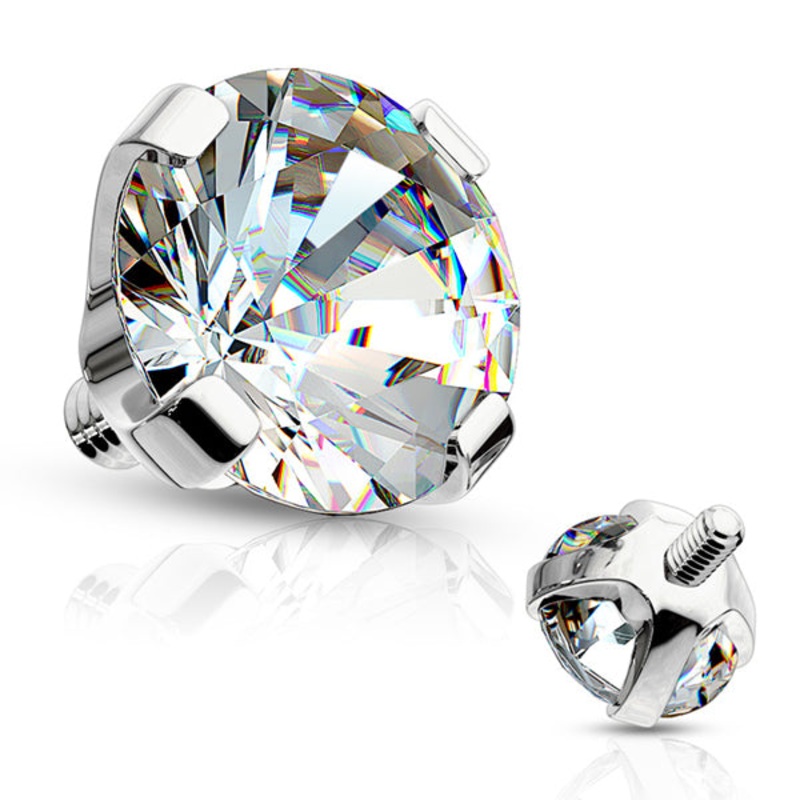 The 14 gauge prong-set cz dermal anchor top is made from solid white 14k gold. These will fit most any 14 gauge internally threaded straight barbell, labret or dermal anchor. We cannot guarantee compatibility with curved barbells. Choose the size of your clear cz below.