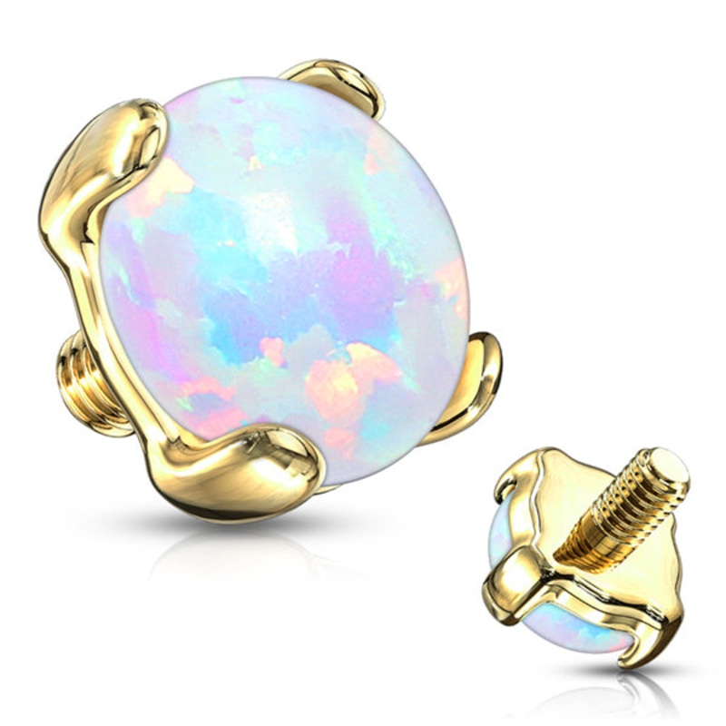 The prong-set synthetic opal dermal anchor top is made from solid yellow 14k gold. These will fit most any 14 gauge internally threaded straight barbell, labret or dermal anchor. We cannot guarantee compatibility with curved barbells. Choose the size of yo