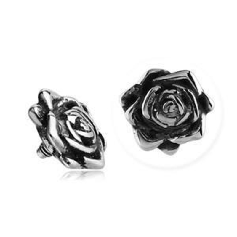 The 14 gauge rose is made from 316L stainless steel. It measures approximately 6.5mm in diameter. These will fit most any 14 gauge internally threaded straight barbell, labret or dermal anchor. We cannot guarantee compatibility with curved barbells.