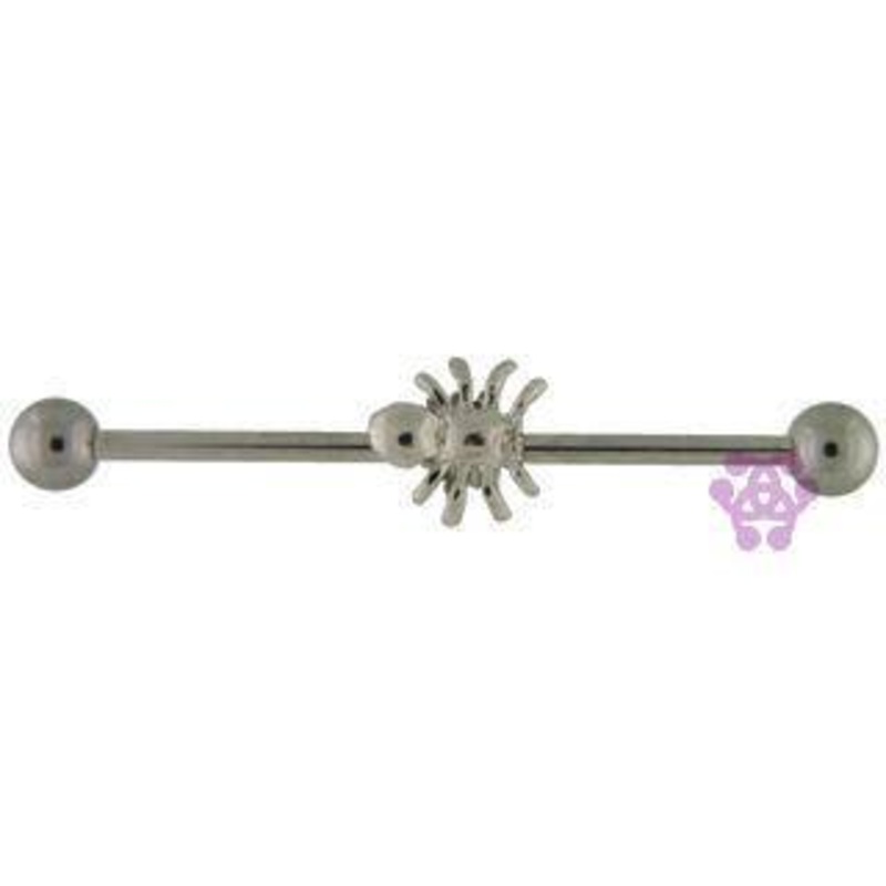 The 14 gauge spider industrial barbell is made from 316L stainless steel with external threading. The charm is fixed to the barbell.