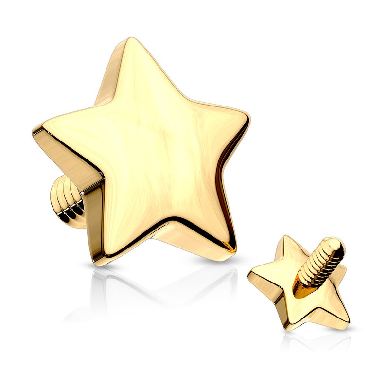 The 14 gaugestar dermal anchor topismade from solid yellow 14k gold. These will fit most any 14 gauge internally threaded straight barbell, labret or dermal anchor. We cannot guarantee compatibility with curved barbells.