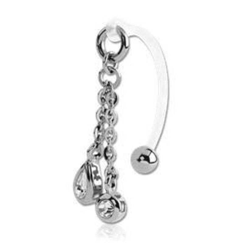 These 14 gauge curved bioflex barbells are 5/8" long, but can be trimmed down to any desired length. Only the 316L stainless steel 5mm ball end is removable. These are a great option for a VCH piercing. The gems are available in clear only. Choose your gem