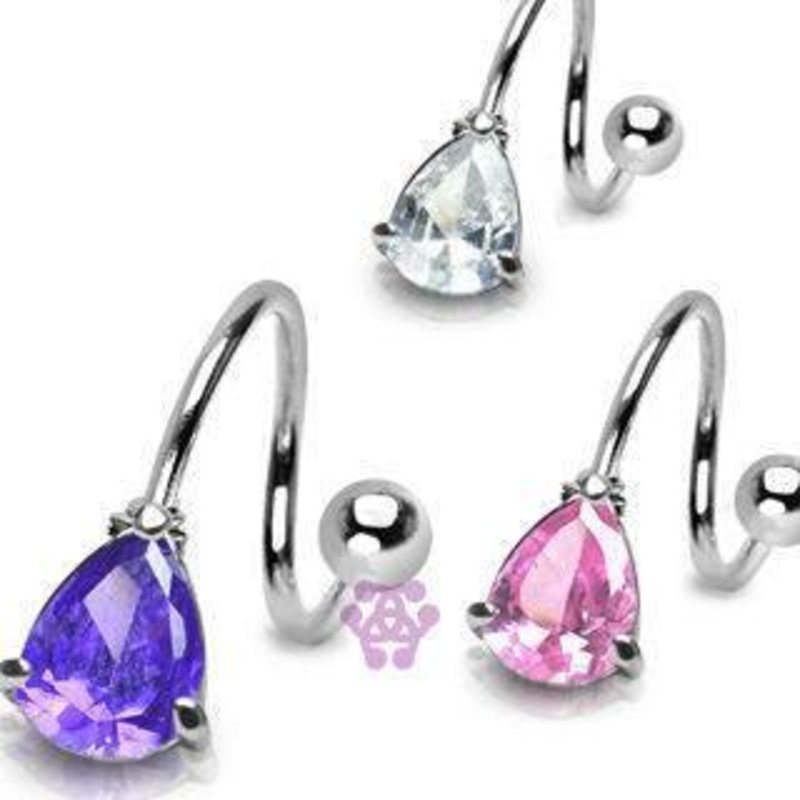The 14 gauge teardrop cz spiral barbell is made from 316L stainless steel with external threading. Only the 5mm ball end is removable. Choose your gem color below.