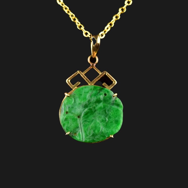 14K Gold Carved Green Jade Fish Pendant Necklace