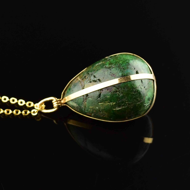 Indulge in the luxurious and distinctive vintage 14K gold Connemara marble pendant necklace. The captivating green marble is shaped in an egg or ball and delicately encased in a lavish gold bar. This unique piece adds a touch of color to any layered look,