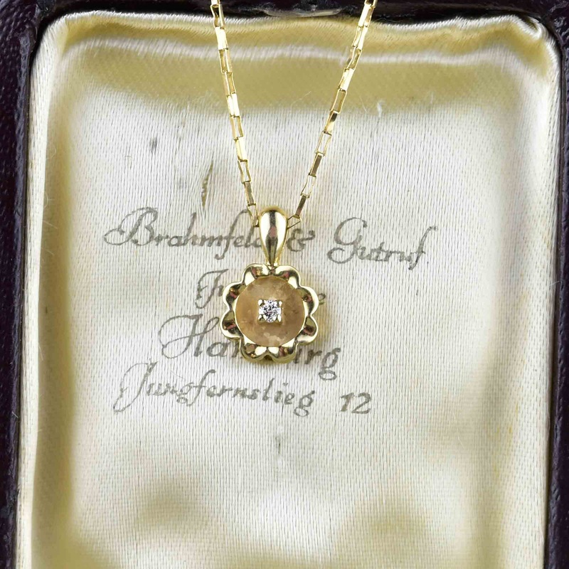 This vintage pendant necklace is an elegant and timeless piece of jewelry. Made of solid 14 karat yellow gold, it features a stunning solitaire diamond in a floral design. This necklace is a meaningful gift for anniversaries, weddings, birthdays, and other