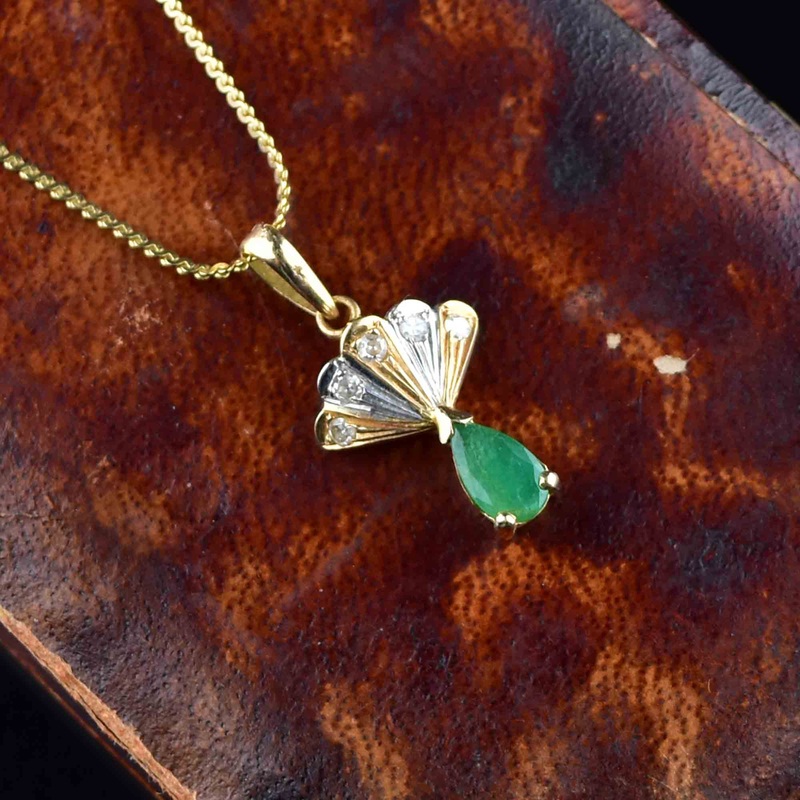 14K Gold Fan Diamond Emerald Pendant Necklace
