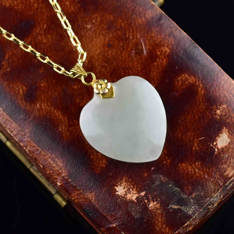 14K Gold Floral Carved Jade Heart Pendant Necklace