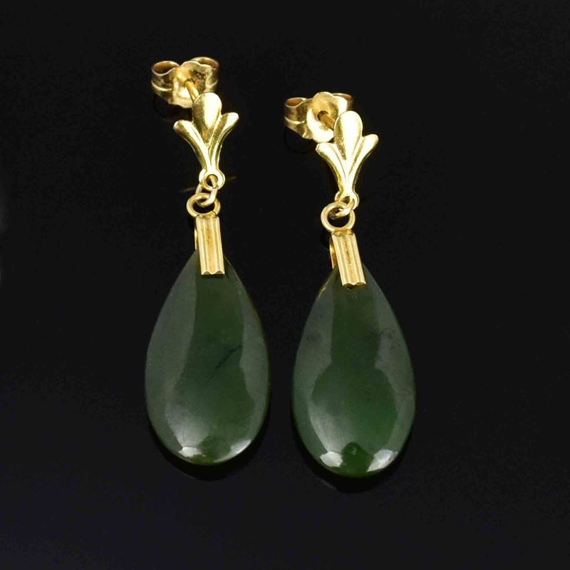 14K Gold Fluer de Lis Jade Teardrop Earrings