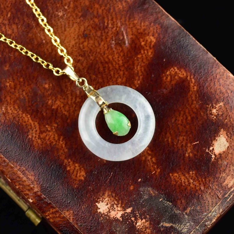 An elegant vintage jade pendant with a unique target design. The center stone is a pear-cut green jade, surrounded by a thick white jade donut. Jade has been used for centuries to attract love – a lovely sentiment and a truly stunning piece of jewelry!