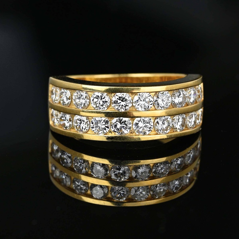 Featuring stunning 1.25 carats of shimmering diamonds, this 14K gold vintage band provides the ideal wedding or anniversary ring. The diamonds are precisely channel set in a heavy and durable gold setting, creating a double row half eternity design. It can