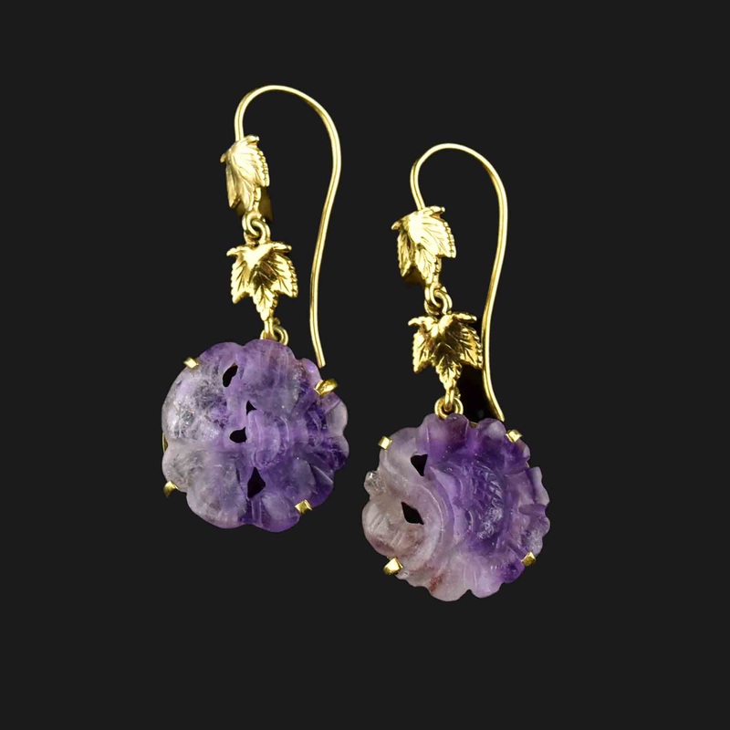 14K Gold Maple Leaf Carved Amethyst Drop Earrings