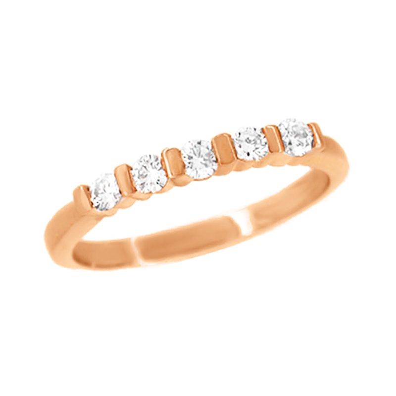This romantic rose gold channel set diamond wedding ring features five white round brilliant diamonds set in a classic straightline channel setting.