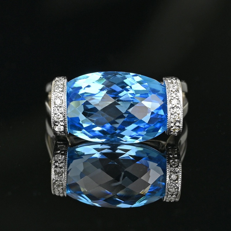 Expertly designed in 14K white gold, this vintage estate ring showcases a stunning cushion checkerboard cut blue topaz gemstone, complemented by dazzling white diamonds set in an east to west orientation. With a generous 8.32 carat weight, this unique ring