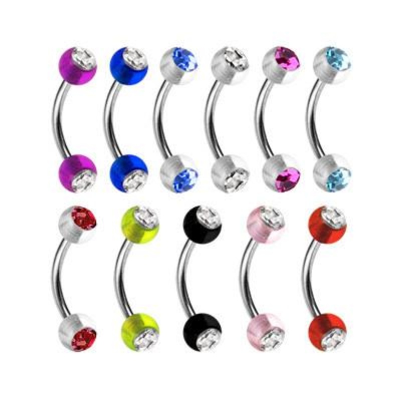 The 16 gauge cz curved barbell is made from 316L stainless steel with external threading. Both 4mm acrylic balls are removable. Choose your size and color below.