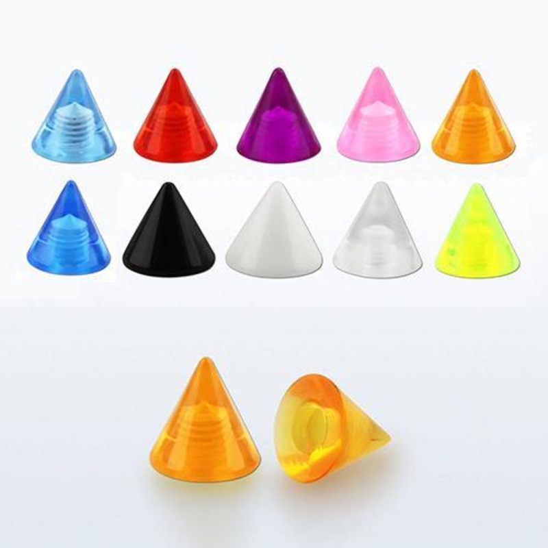 You'll get a four pack of matching 3x3mm acrylic cones that will fit most any 16g externally threaded barbell. Choose your color below.