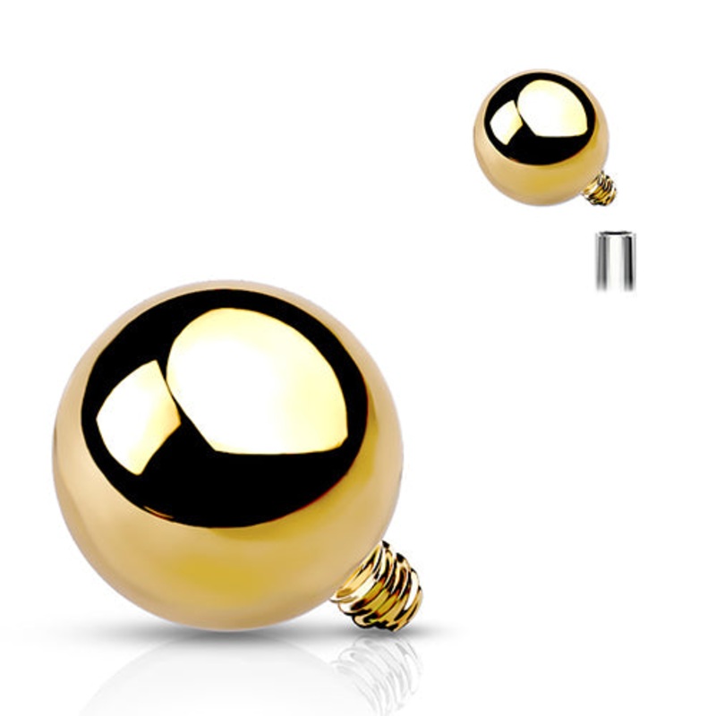 The 16 gauge ball replacementendis made from goldPVD coated 316L stainless steel. These will fit most any 16 gauge internally threaded straight barbell or labret. We cannot guarantee compatibility with curved barbells. Choose your size below.