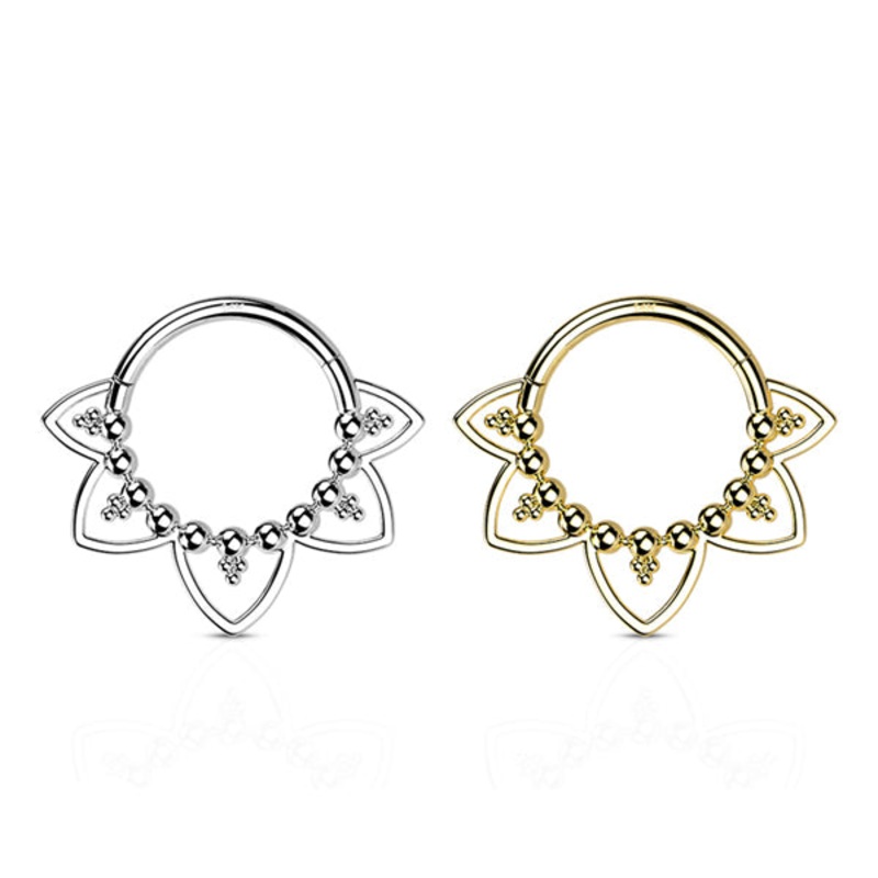 The 16 gauge beaded heart hinged segment ring is made from solid 14k gold. They're nickel free, hypoallergenic, and polished to a mirror finish. These look just like a regular segment ring, but so much easier to use (no ring openers are required). Choose y