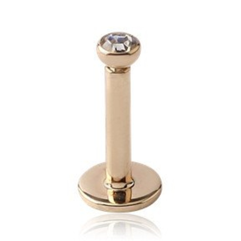 The 16 gauge labret barbell is made from solid 14k yellow gold with internal threading. The bezel-set cz gemstone is available in clear only. It's hypoallergenic, nickel free, and polished to a mirror finish. Only the gem end is removable. Choose your gem
