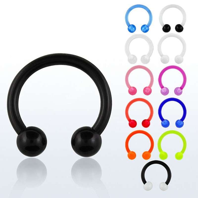 The 16 gauge circular barbell is made from flexible polyethylene with external threading. Both acrylic ball ends are removable. Choose your size and color below.[click here for replacement balls]