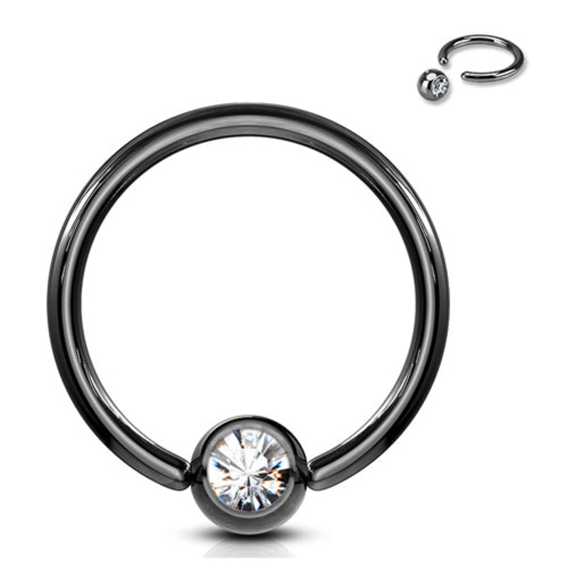 The 16 gauge captive bead ring is made from black PVD coated 316L stainless steel. Choose your size and gem color below.
