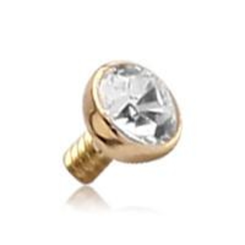 The 16 gauge bezel-set cz replacement end is made from solid yellow 14k gold. These will fit most any 16 gauge internally threaded straight barbell or labret. We cannot guarantee compatibility with curved barbells. The gem has a 2.5mm diameter.