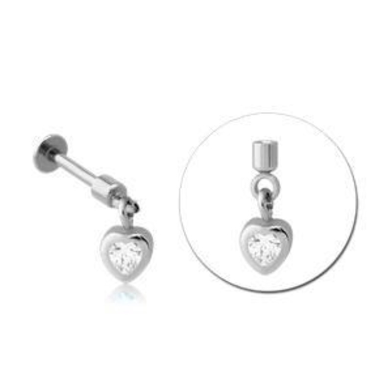 The 16 gauge cz heart dangle cartilage barbell is made from externally threaded 316L stainless steel. Only the dangle end is removable. The gem is available in clear only.