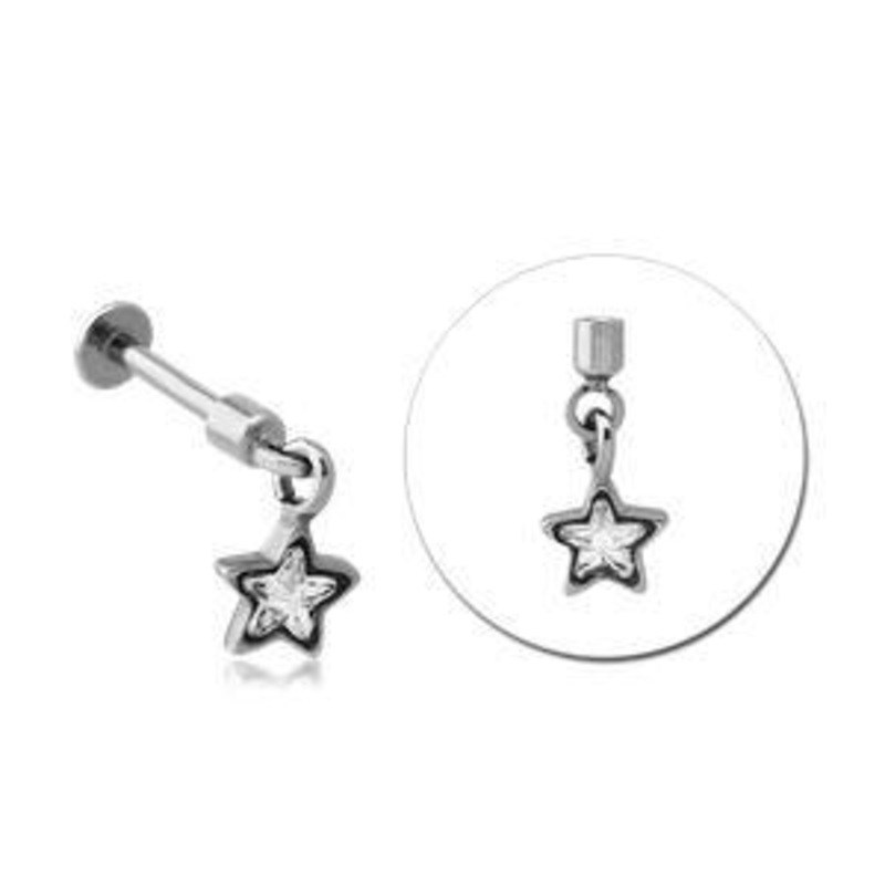 The 16 gauge cz star dangle cartilage barbell is made from externally threaded 316L stainless steel. Only the dangle end is removable. The gem is available in clear only.