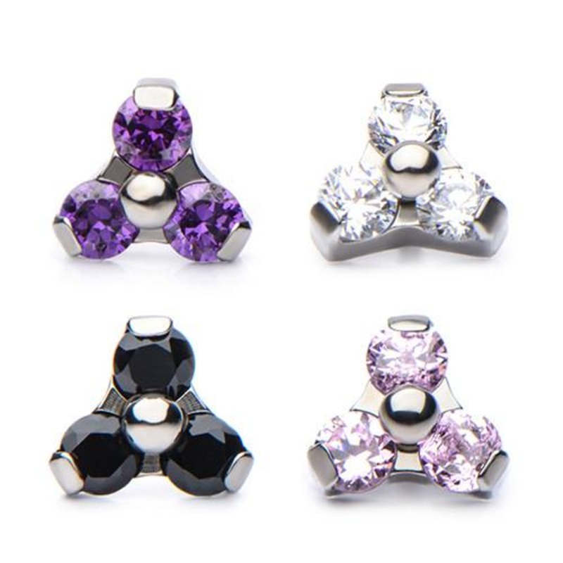 The 16 gauge cz trinity replacement end is made from high polish grade 23 titanium (Ti 6Al-4V ELI ASTM F136) with 2mm prong-set faceted stones. It has an overall size of approximately 5mm. These will fit most any 16 gauge internally threaded straight barbell or labret. We cannot guarantee compatibility with curved barbells. Choose your gem color below.