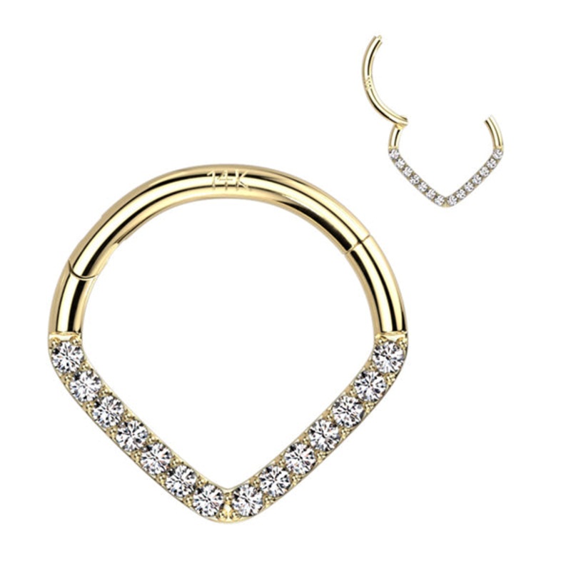 16g CZ V-Shaped 14k Gold Hinged Ring 16g – 3/8″ diameter (10mm) Clear Yellow 14k Gold