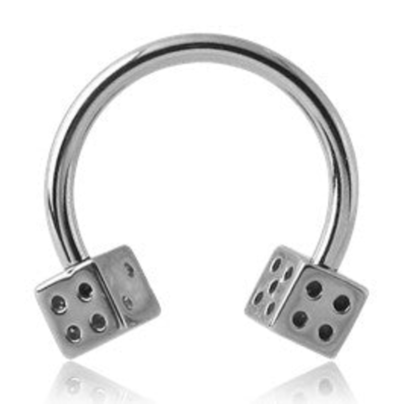 The 16 gauge circular barbell is made from 316L stainless steel with external threading. Both dice ends are removable. Choose your size below.